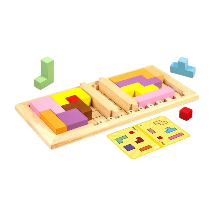 Wooden game board β’ 18 colorful wooden pieces β’ Challenge booklet