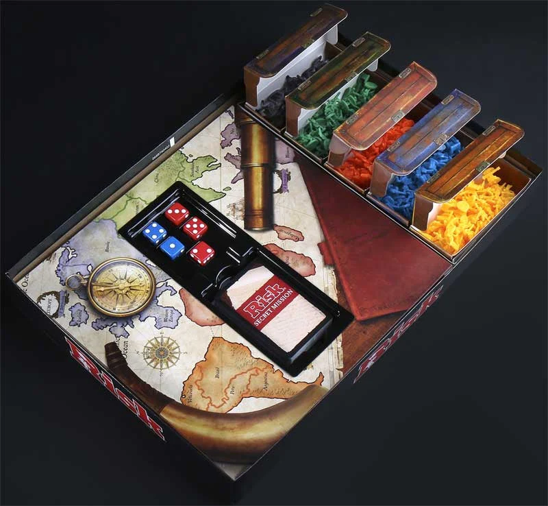 Game board, army pieces, cards, dice, and detailed instructions
