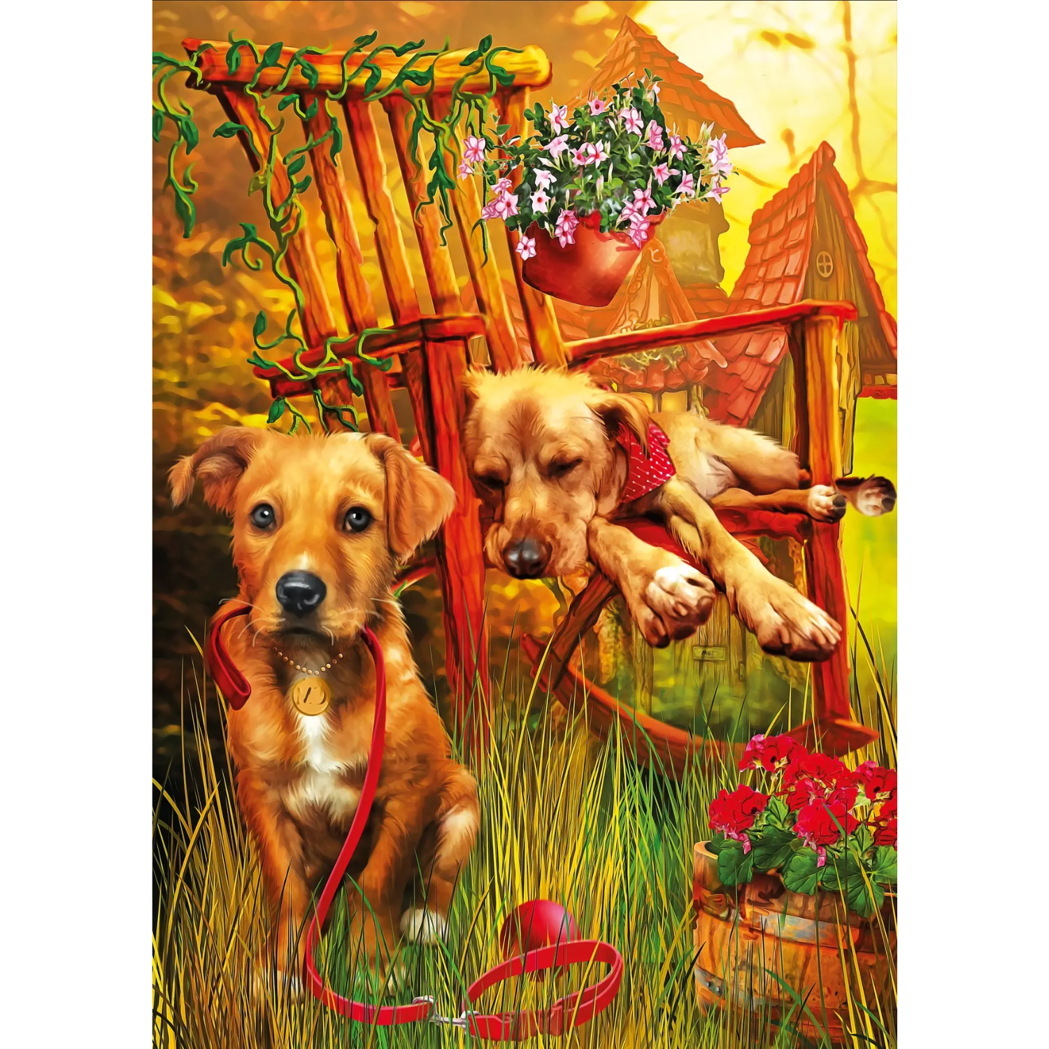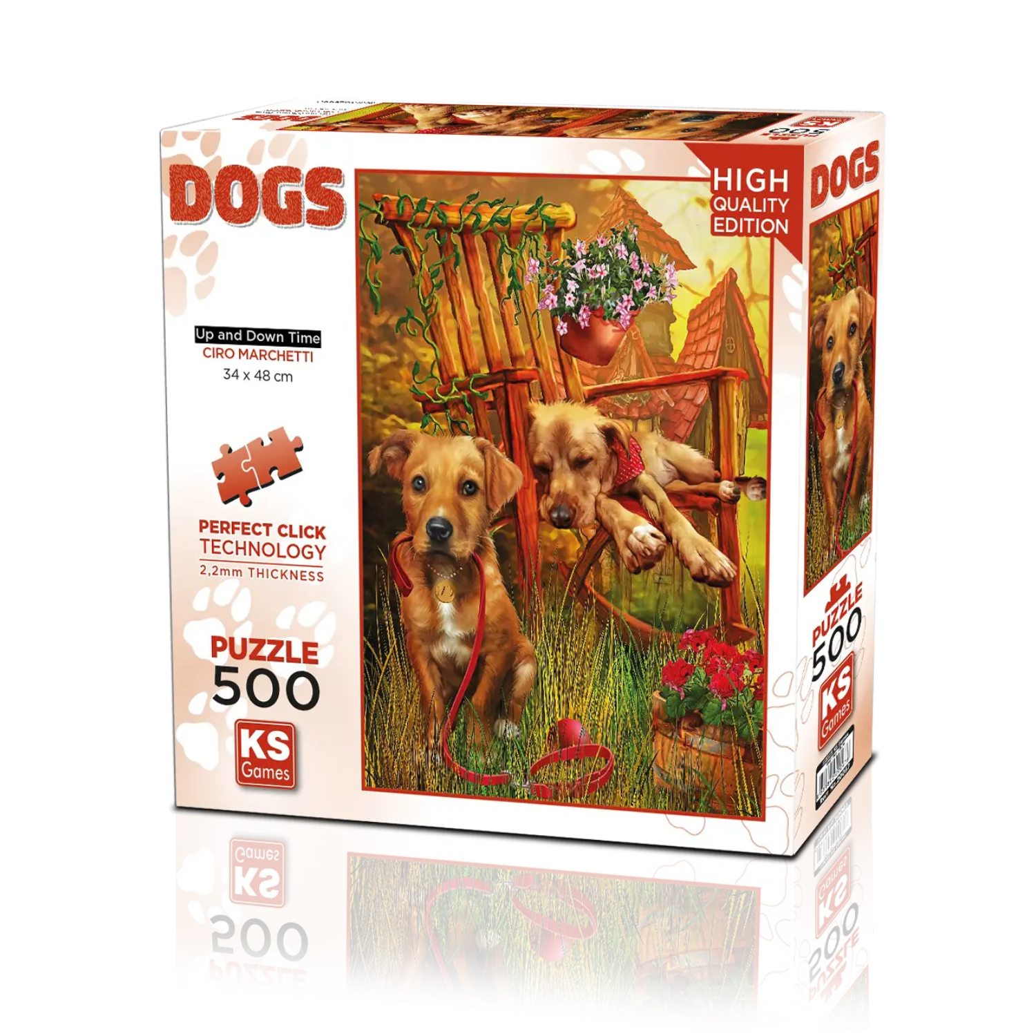 Fall in love with the charm of manโs best friend in KS Gamesโ โUp and Down Timeโ, a 500-piece puzzle filled with warmth, color, and heart. Illustrated by Ciro Marchetti, this delightful scene captures two adorable dogs โ one resting, one alert โ enjoying a sunny afternoon in a cozy garden setting.